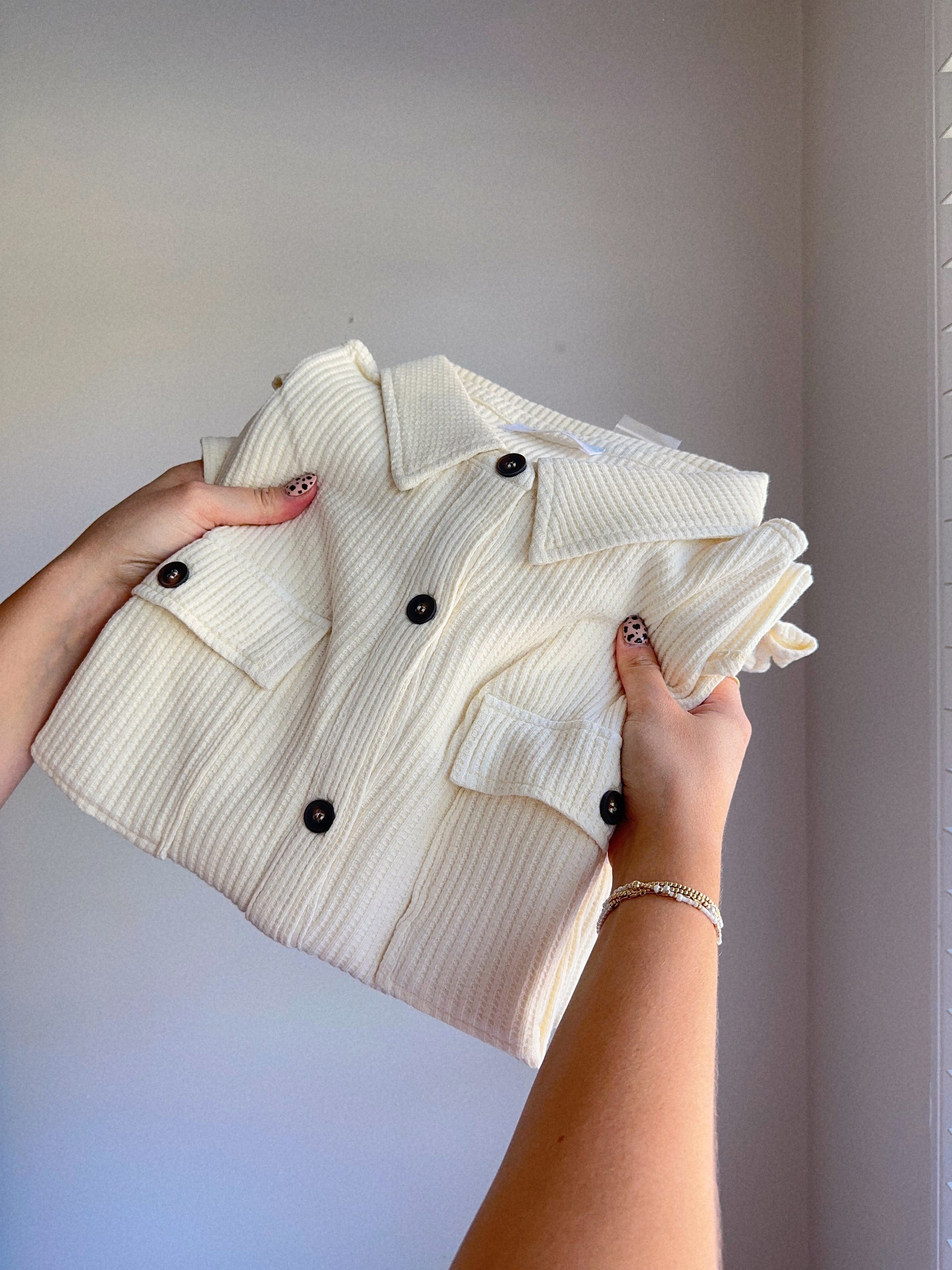 You will find yourself reaching for this cream waffle knit layering piece all season, as it features an oversized soft, 100% cotton material, darling button detailing down the front (wear this adorable piece open with your favorite graphic tee or bodysuit, or closed as a top!), and a subtle collared neckline.