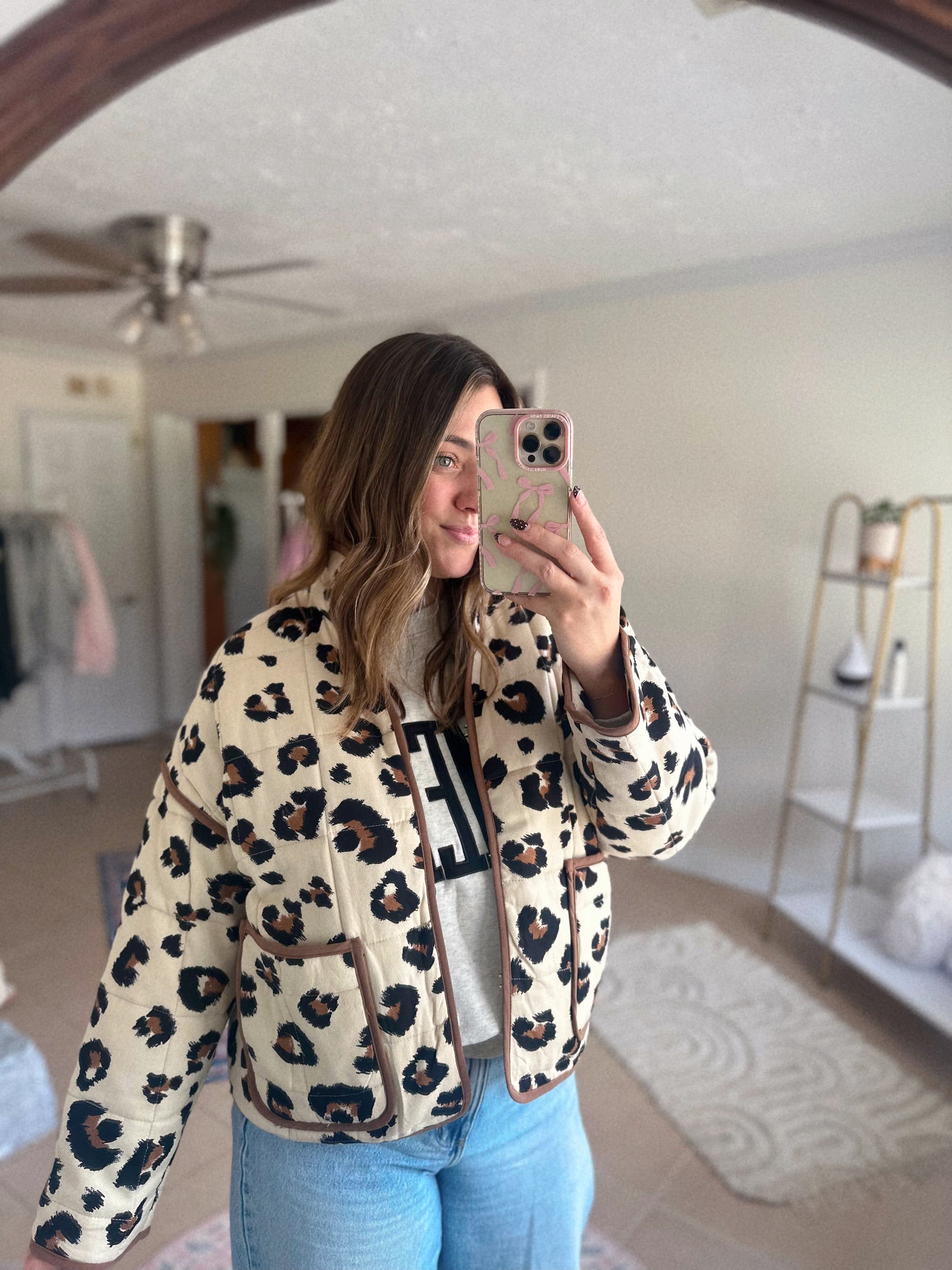 Leopard print is here to stay + ready to make a statement in your closet with our new quilted jacket! Perfect to layer those Fall outfits with or wear as is with your favorite sweater, featuring a hook & eye closure at the front + the cutest pockets!