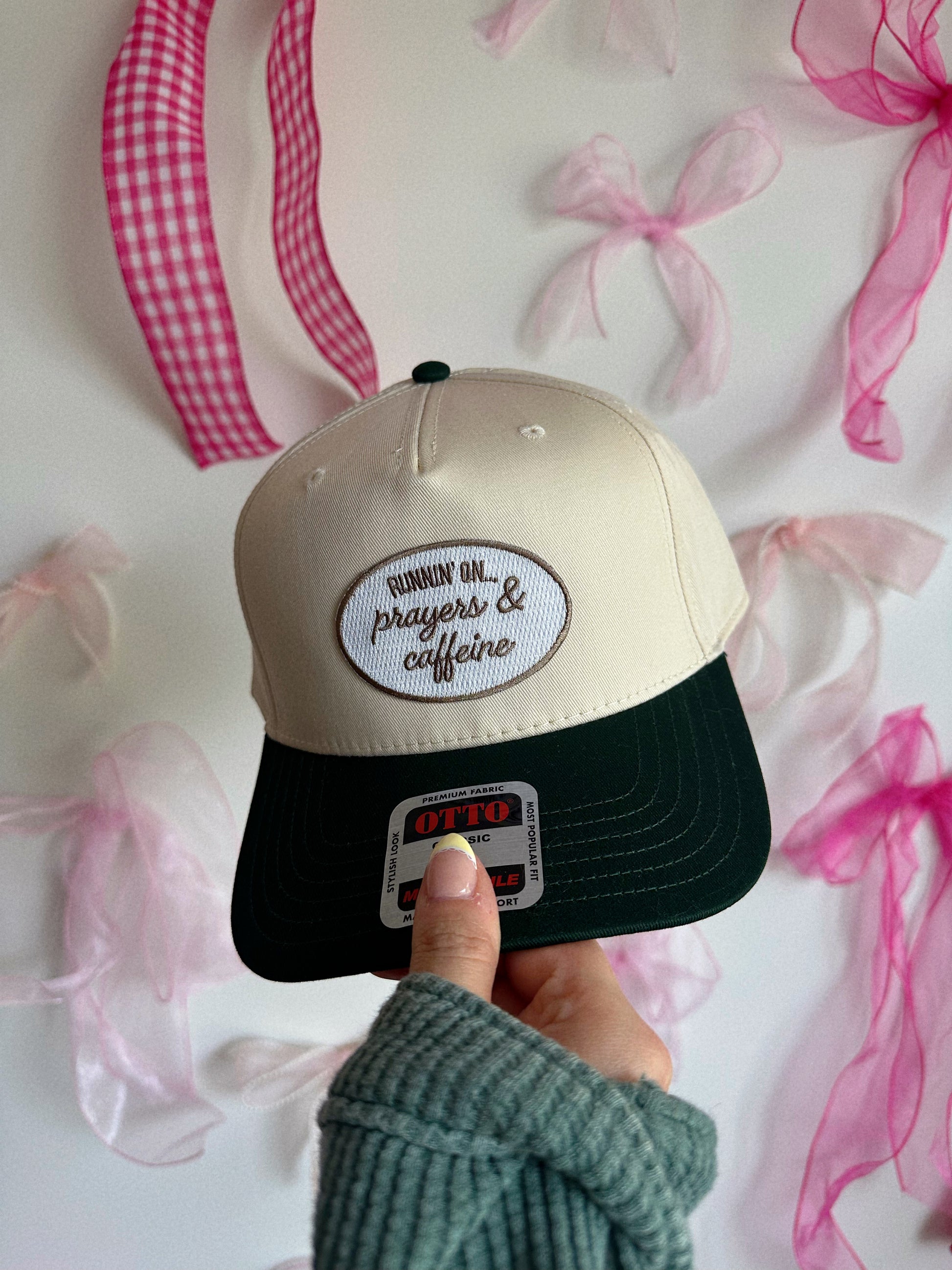 Runnin' on Prayers + Caffeine over here, if you relate you need this hat on rotation in your collection! This adorable trucker hat features a white patch with the cutest embroidered font with a dark green colored hat!