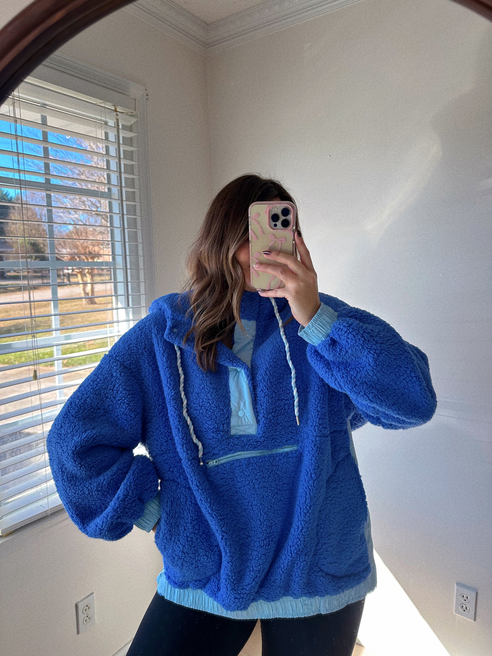 One word: OBSESSED! Oversized, soft as ever (imagine wearing a blanket) + has the cutest features! Our new curvy Frosty Blue Sherpa Pullover is going QUICK + for good reason! You are bound to LOVE this piece the second you put it on!